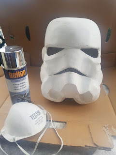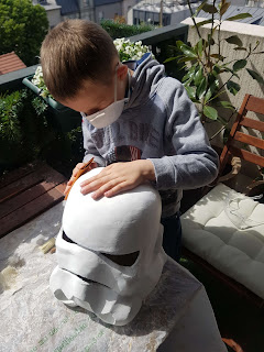 Préparation de la première couche de peinture. L’objectif est d’essayer de donner une illusion d’impacts … (demande de mon fils d’avoir des traces de balles et de sabre). La première couche est argentée pour donner l’illusion que le casque est en acier … sous la peinture.