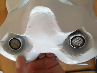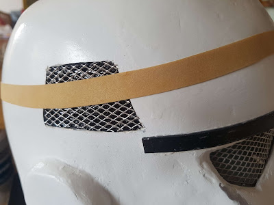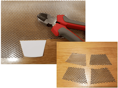 Avec une feuille de papier, indiquer le contour des yeux et utiliser ce patron pour découper dans la grille en ajoutant 1 a 2 centimètres pour permettre d’épouser la forme (intérieur) du casque et pouvoir coller la grille.