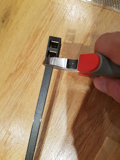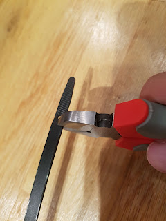 La partie supérieure j’ai utilisé des colliers de 250 mm sur 9 mm. Couper les deux extrémités puis coller. L’astuce trouvée a été d’utiliser un élastique pour maintenir le collier le temps que colle sèche parfaitement. Il est possible d’en coller un deuxième pour donner de l’epaisseur avec le même procédé.