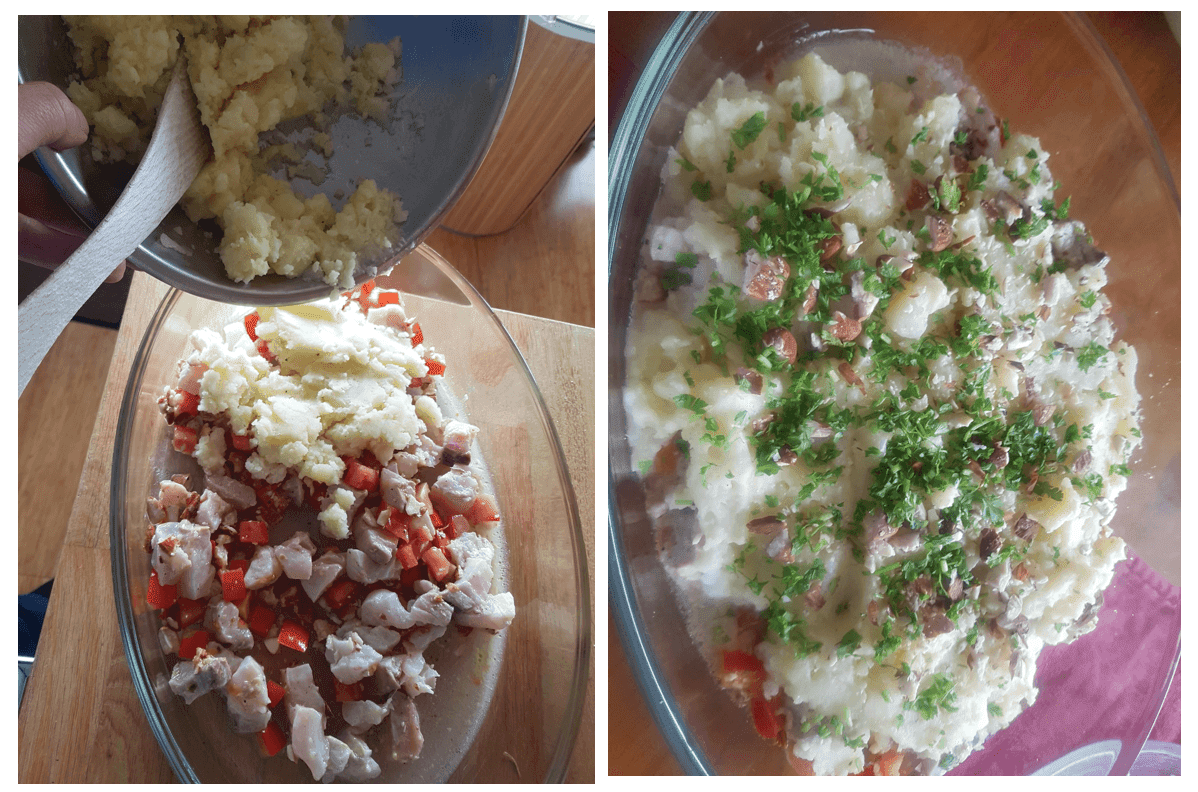 Versez au fond du plat, la marinade de poisson puis par dessus la purée. Pour finaliser avant d’enfourner parsemer l’ensemble des amandes concassées et un peu de beurre par endroits.
