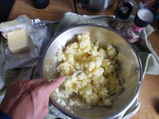 Egouter les pommes de terre puis les écraser dans un saladier avec du beurre (25 grammes pour 2 personnes), de l’huile d’olive (un peu !), sel et poivre. A la fourchette ca permet d’avoir des petits morceaux dans la purée … un délice (avis personnel).