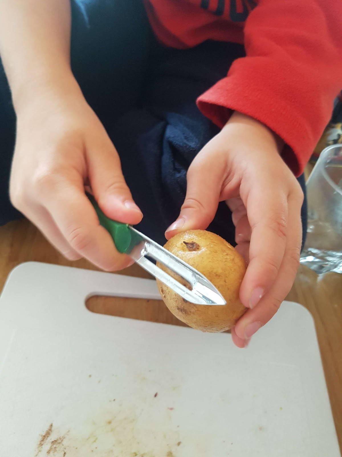 Mine de rien il faut du temps pour expliquer comment tenir la patate en main et le couteau et tous les appuis ! (n’appelez pas le JAF ou la DASS… nous nous sommes arrêté à une épluchure le temps de lui apprendre à tenir la patate, l’econome et sentir les appuis pour l’eplucher)