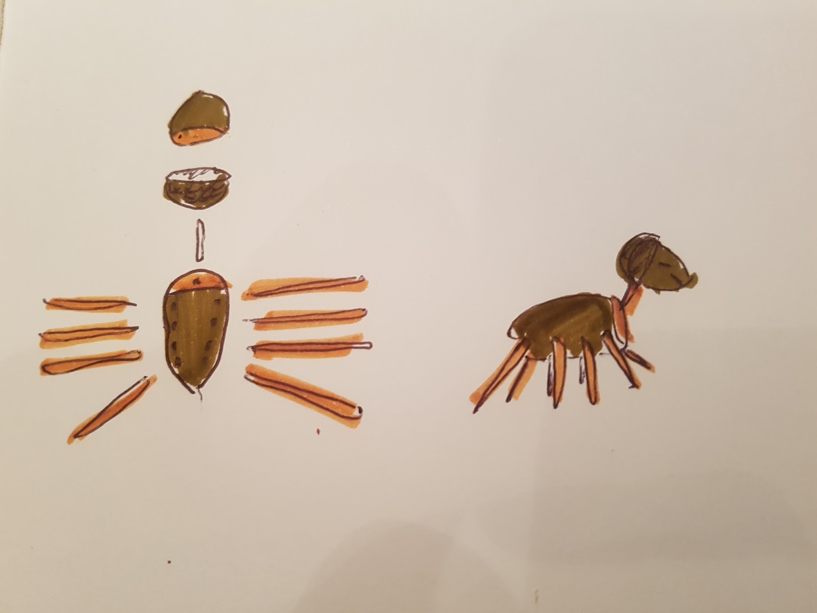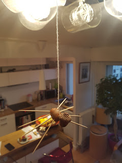 Pour faire cette araignée mon fils a utilisé 2 glands, 1 chapeau de gland et 9 cures dents.