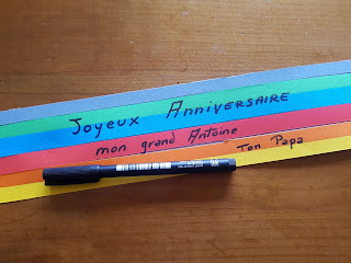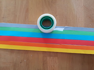 Découper des bandelettes de couleur avant de les coller ensemble comme dans l’exemple ci-dessous :