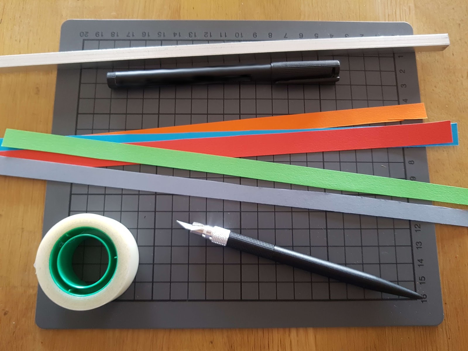 Découper des bandelettes de couleur avant de les coller ensemble comme dans l’exemple ci-dessous :