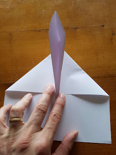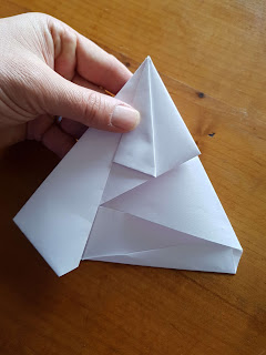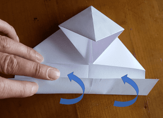 Nous commençons par rapprocher les coins supérieurs (les oreilles pour reprendre l’expression de mon fils 🙂 ) vers le centre :