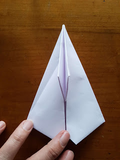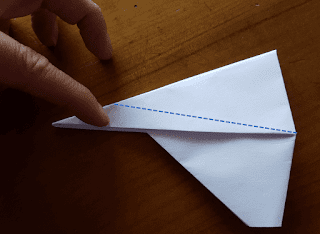 Pliez l’avion en deux avec les ailes à l’intérieur comme ci-dessous. La ligne en pointillé va vous permettre de plier l’arrière de l’avion.