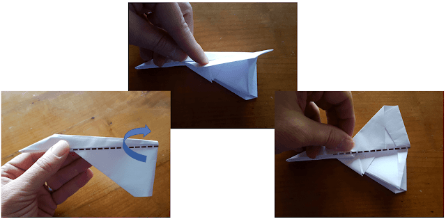 Positionner les ailes comme ci-dessous et rabattez le pliage de l’avion de l’avion (en haut) comme ci-dessous par dessus les ailes :