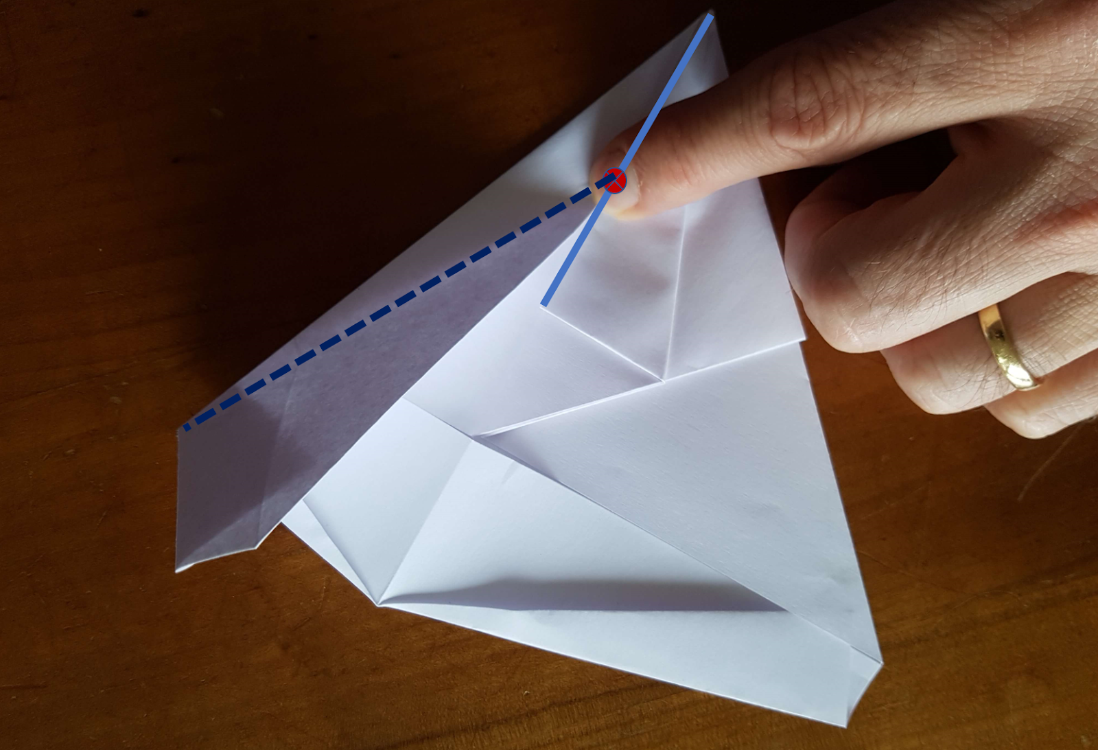 Repérez le milieu du pliage supérieur (point rouge de la ligne bleue). Vous allez plier l’aile en suivant la ligne bleu en pointillé :
