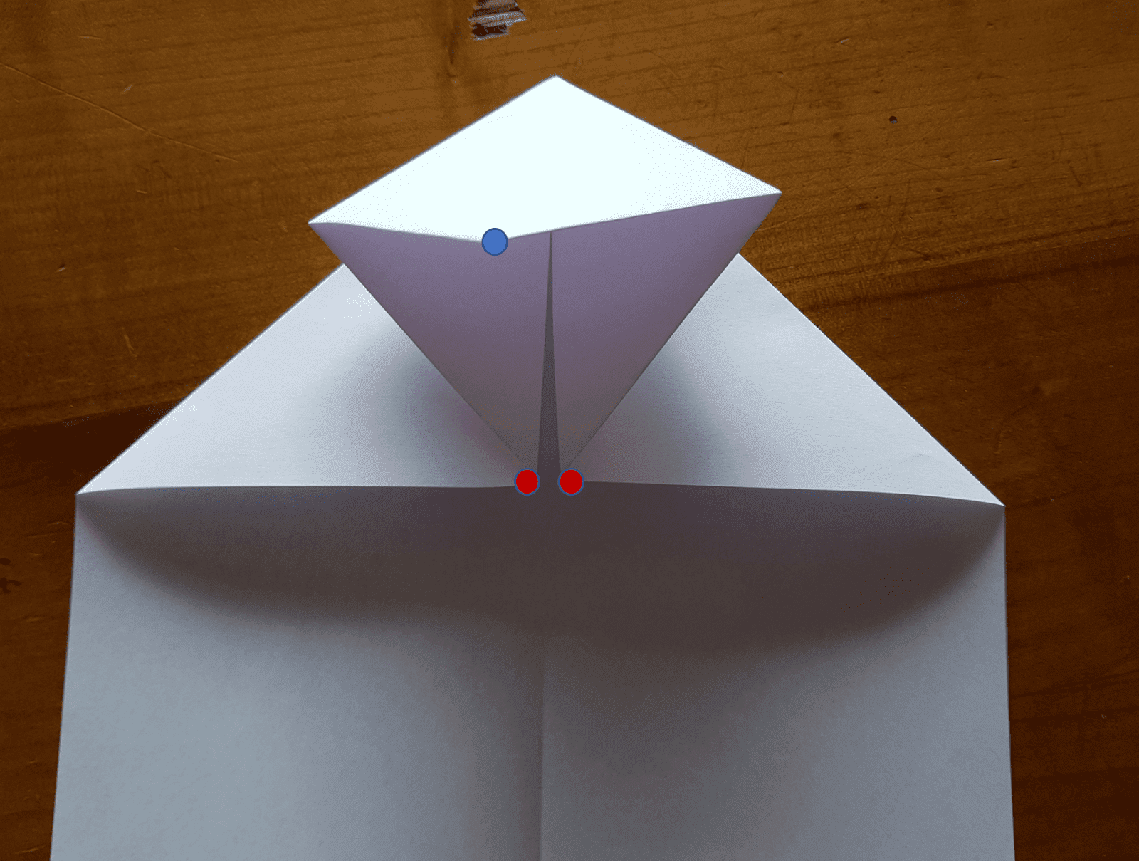 Ensuite, suivez bien les points bleus et rouges pour ce premier pliage qui n’est pas forcement évident la première fois. Mon conseil est de commencer par les points rouges et ensuite de déplacer le coin avec le point bleu vers le bas. Il va presque trouver sa place seul …