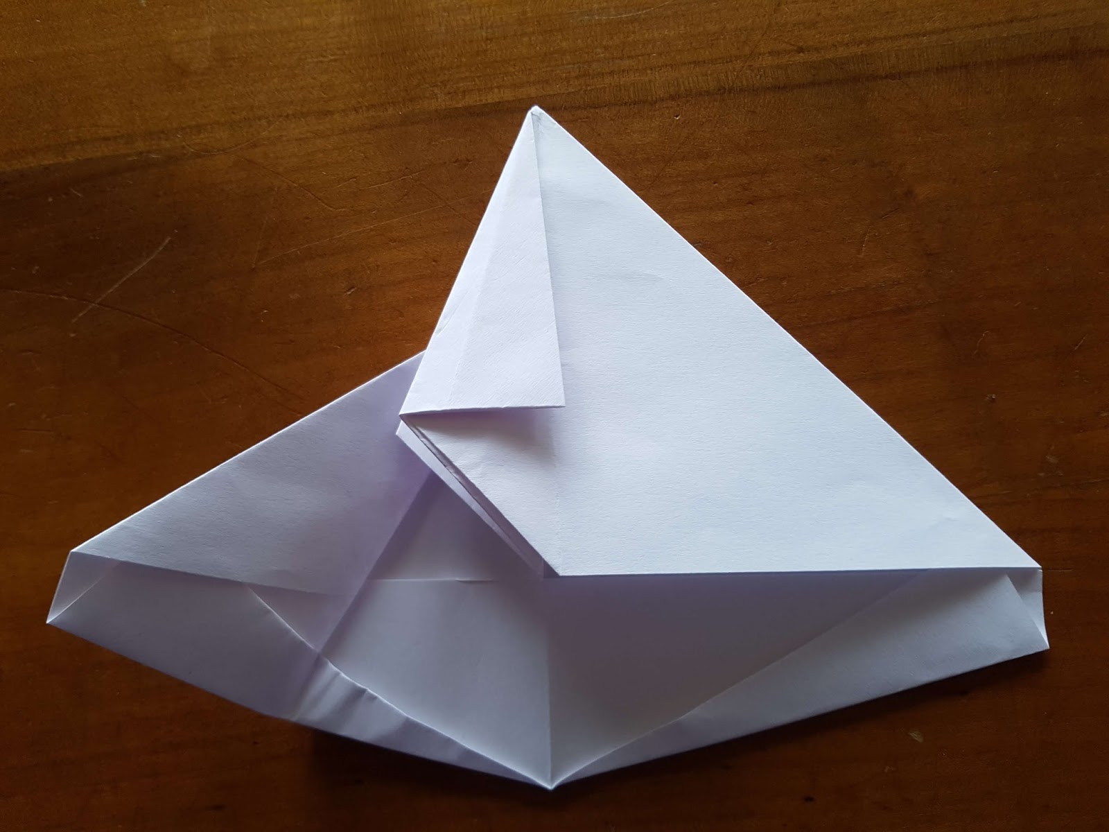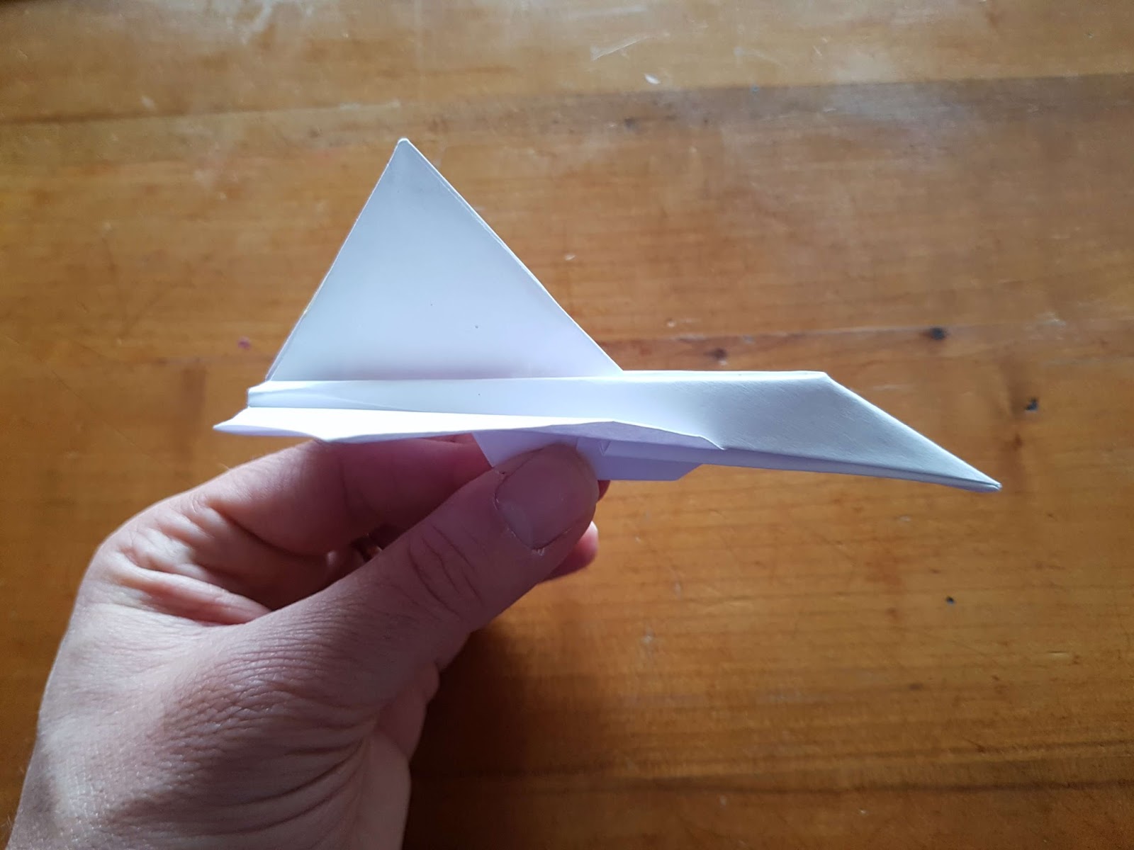 Voilà, à quoi doit ressembler le pliage finale de la première aile .Vous devrez avoir le même pliage. Vous voyez sur la photo, l’avion par dessous, le nez de l’avion étant vers le haut.