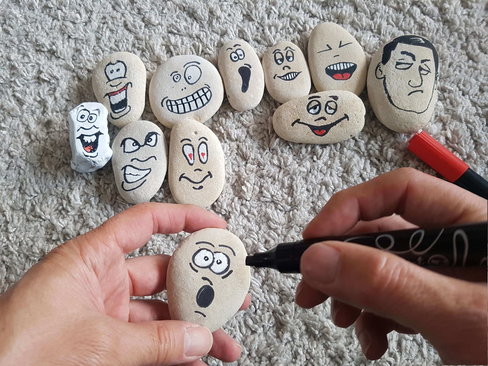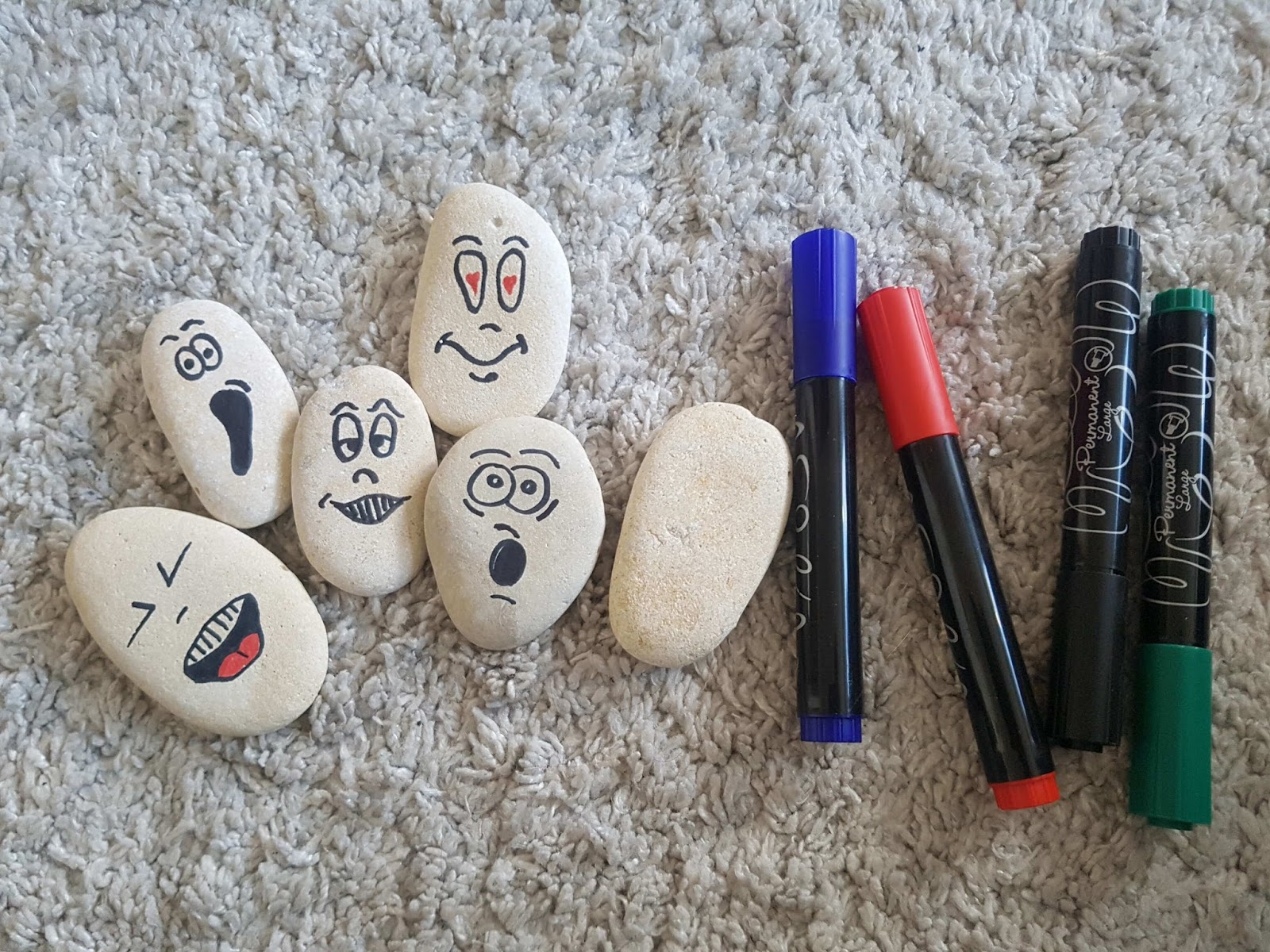 Dans un endroit aéré peindre les pierres. si c’est de la peinture pour les enfants, autant mettre dans la confidence et à participation les enfants …