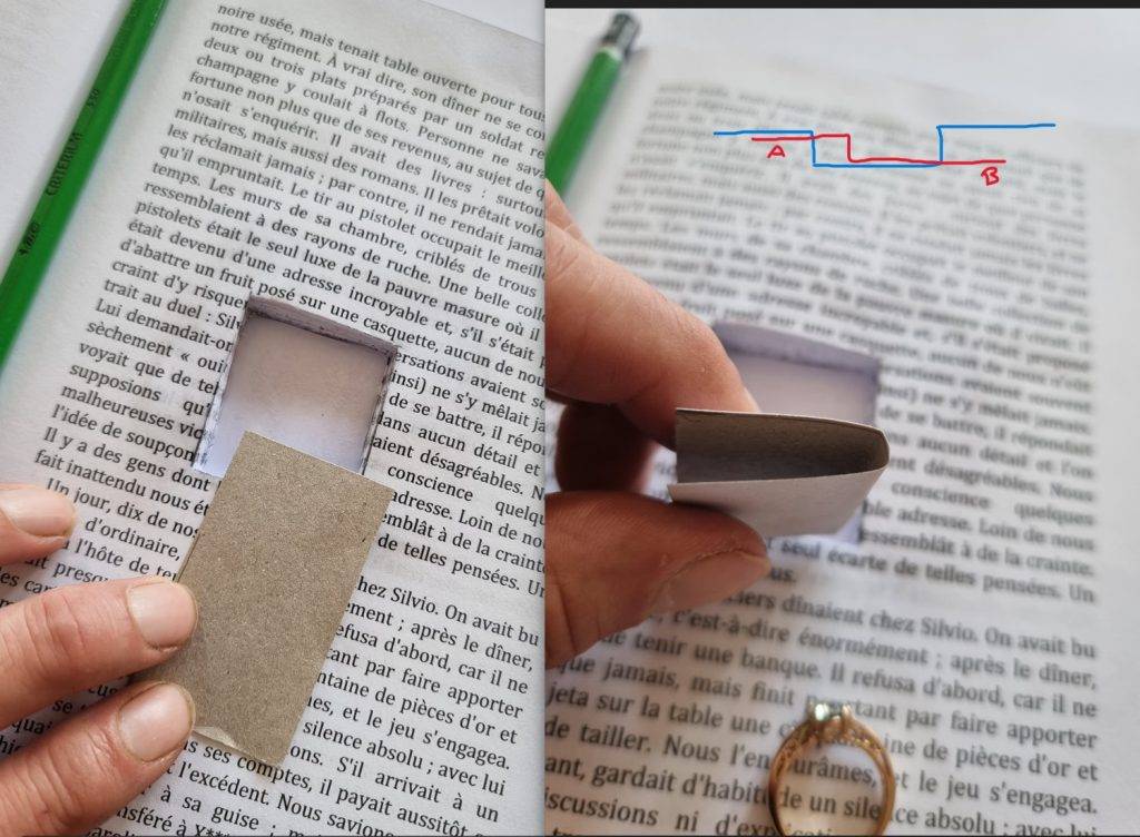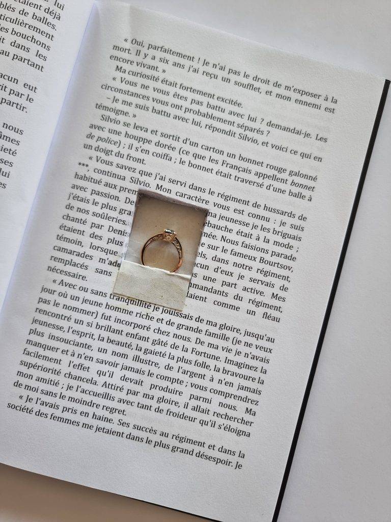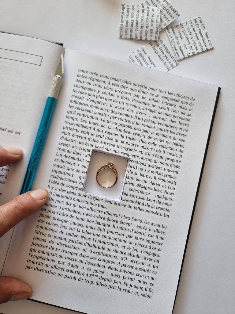 Dans mon cas, j’ai ajouté un petit support pour empêcher la bague de se déplacer dans son emplacement. Pour cela, utilisez un petit morceau de carton découpé à la largeur de l’encoche, puis pliez-le de manière à insérer une extrémité entre les premières pages de la boîte et l’autre extrémité entre les dernières pages à l’opposé. Ce support aidera à maintenir la bague en place de manière sécurisée et évitera qu’elle ne se déplace lors de l’ouverture ou de la manipulation de l’écrin. Assurez-vous que le support est bien fixé et qu’il n’interfère pas avec la fermeture de l’écrin.